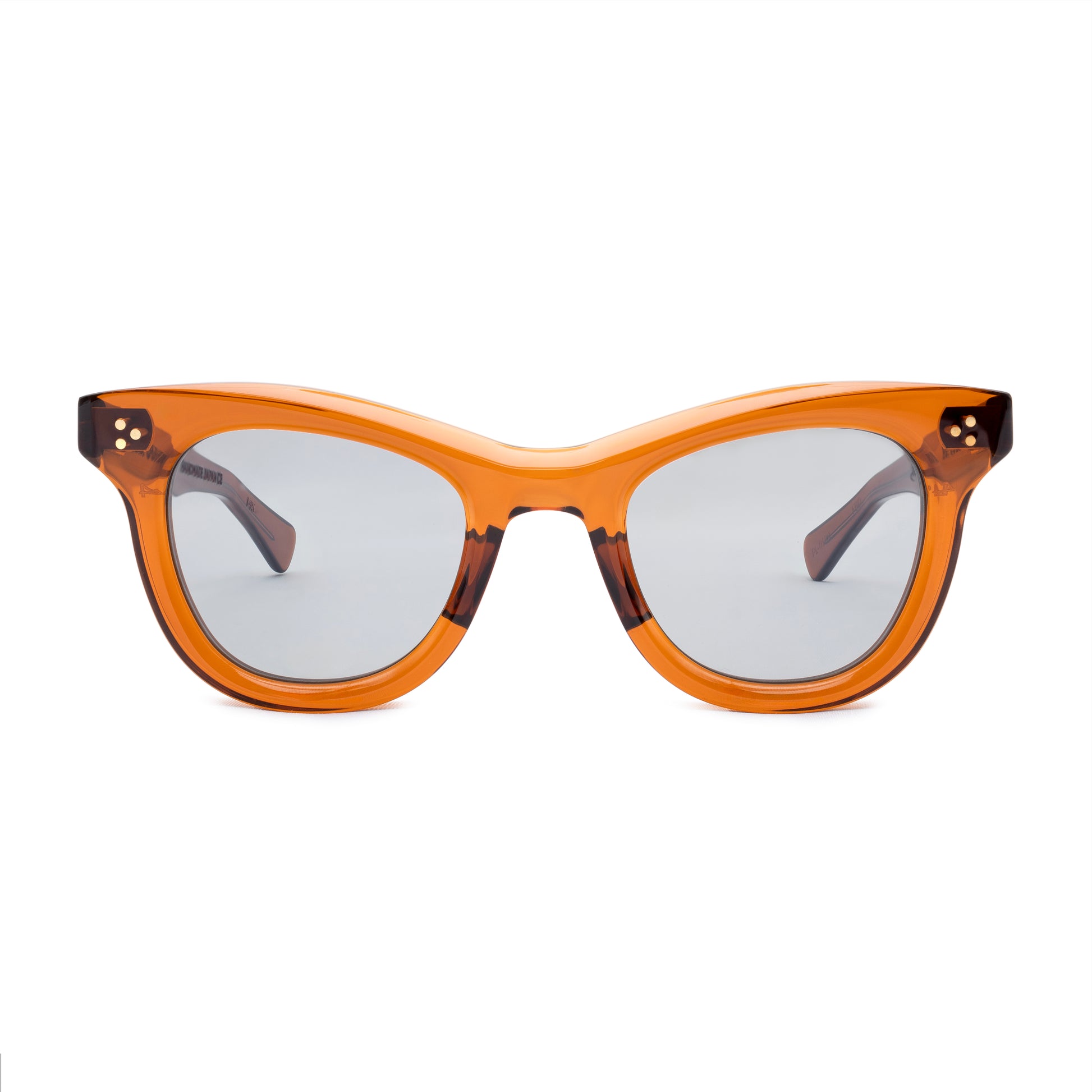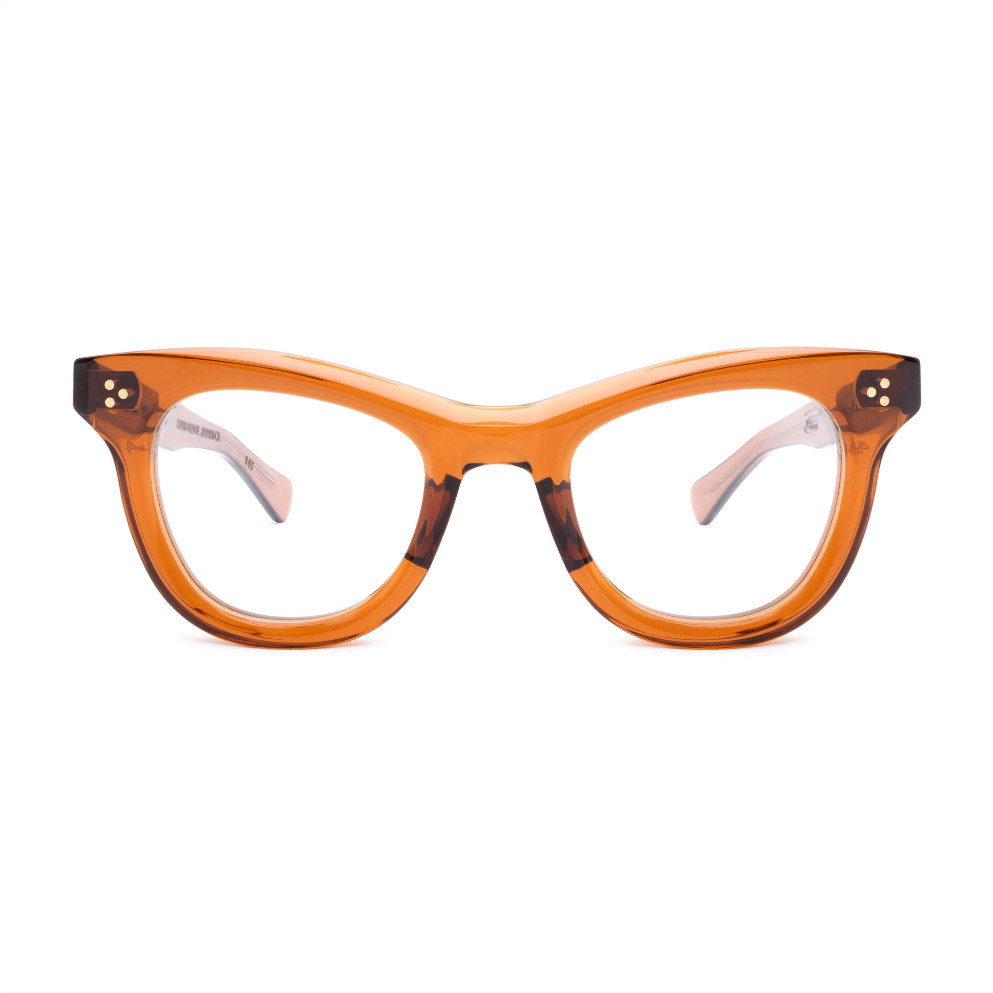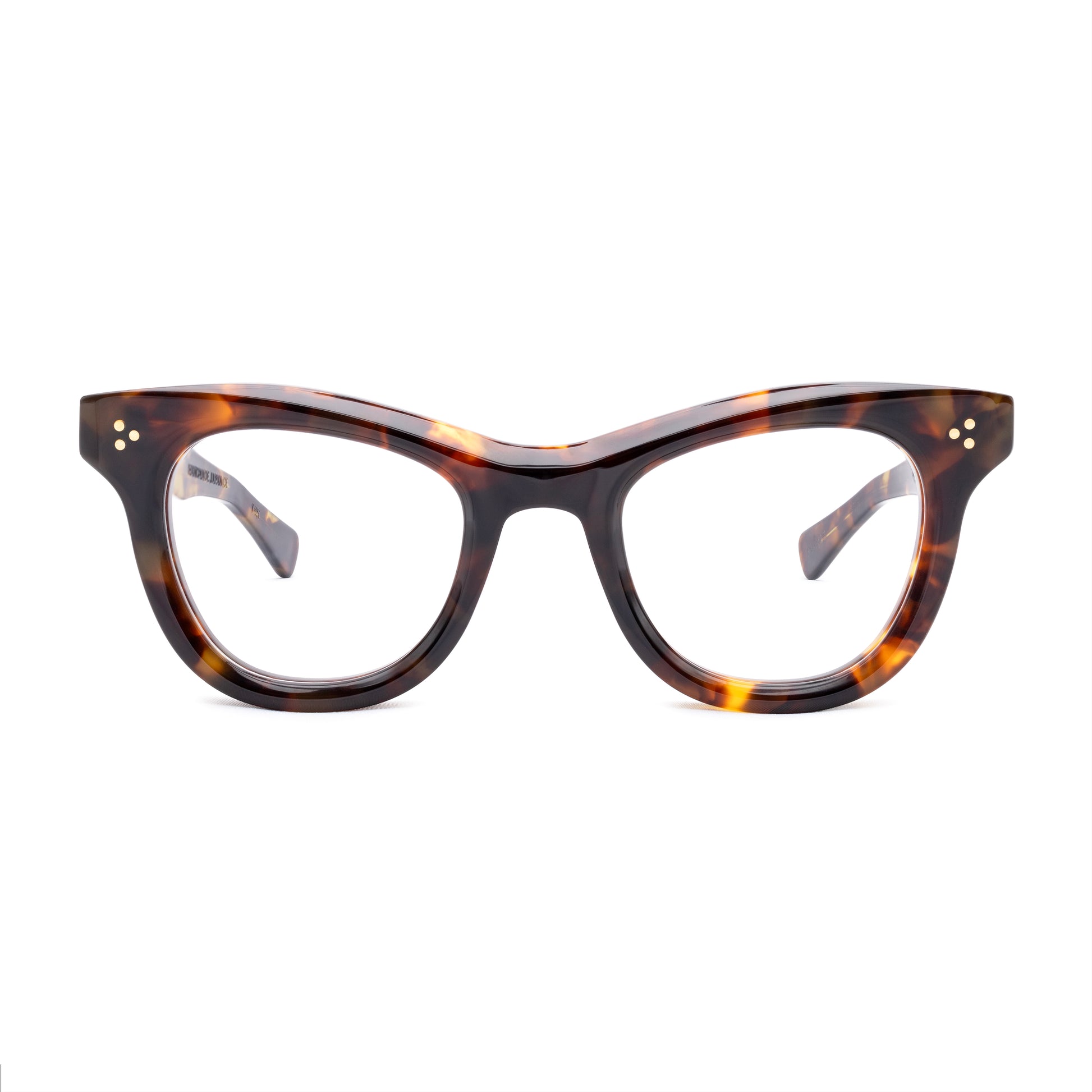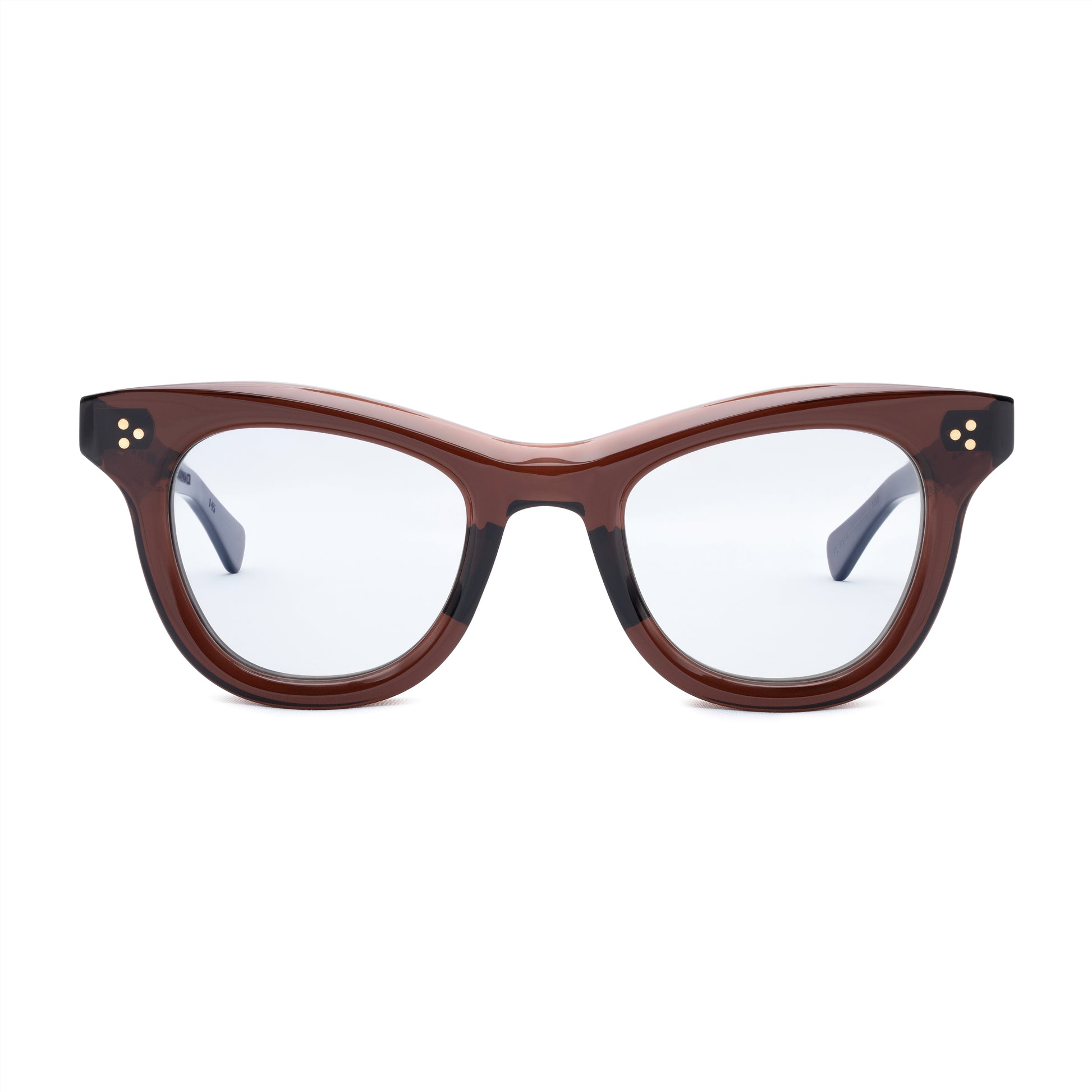 THE FRONT IS TRIPLE RIVETED WITH BRASS PINS, THE SIDE HORIZONTAL DOUBLE PINS. A HEAVY 5-BARREL BRASS HINGE IS THE CONNECTIVE ACTION OF THE FRAME. THE TEMPLE SHAPE MOVES BACK STRAIGHT AND ARTICULATES DOWN JUST BEFORE THE EAR AREA THEN ENDS IN A SQUARED ROUND TIP. SIZE 49□24-145