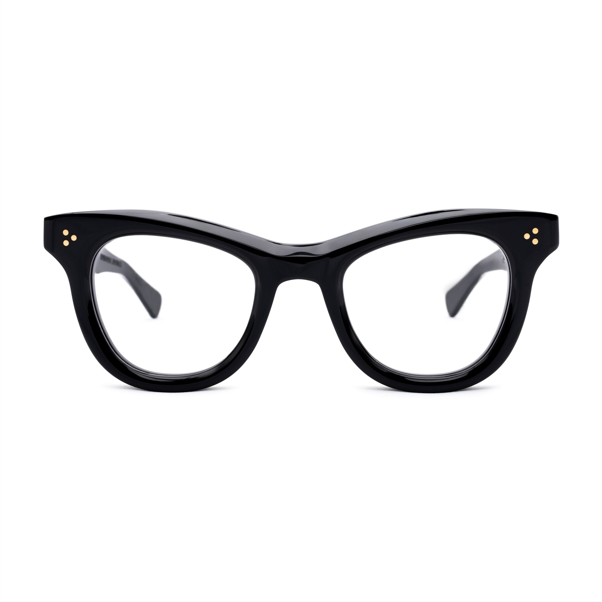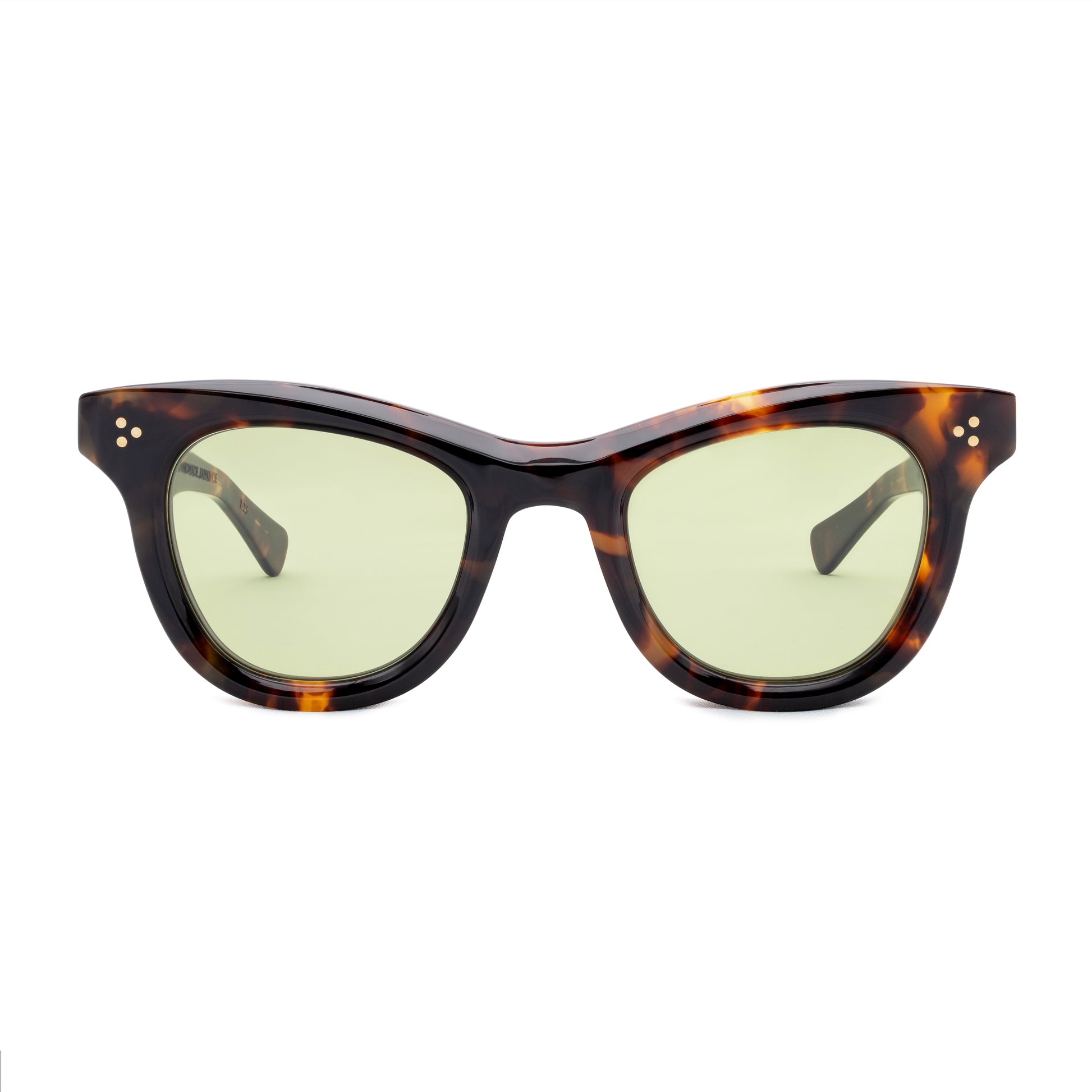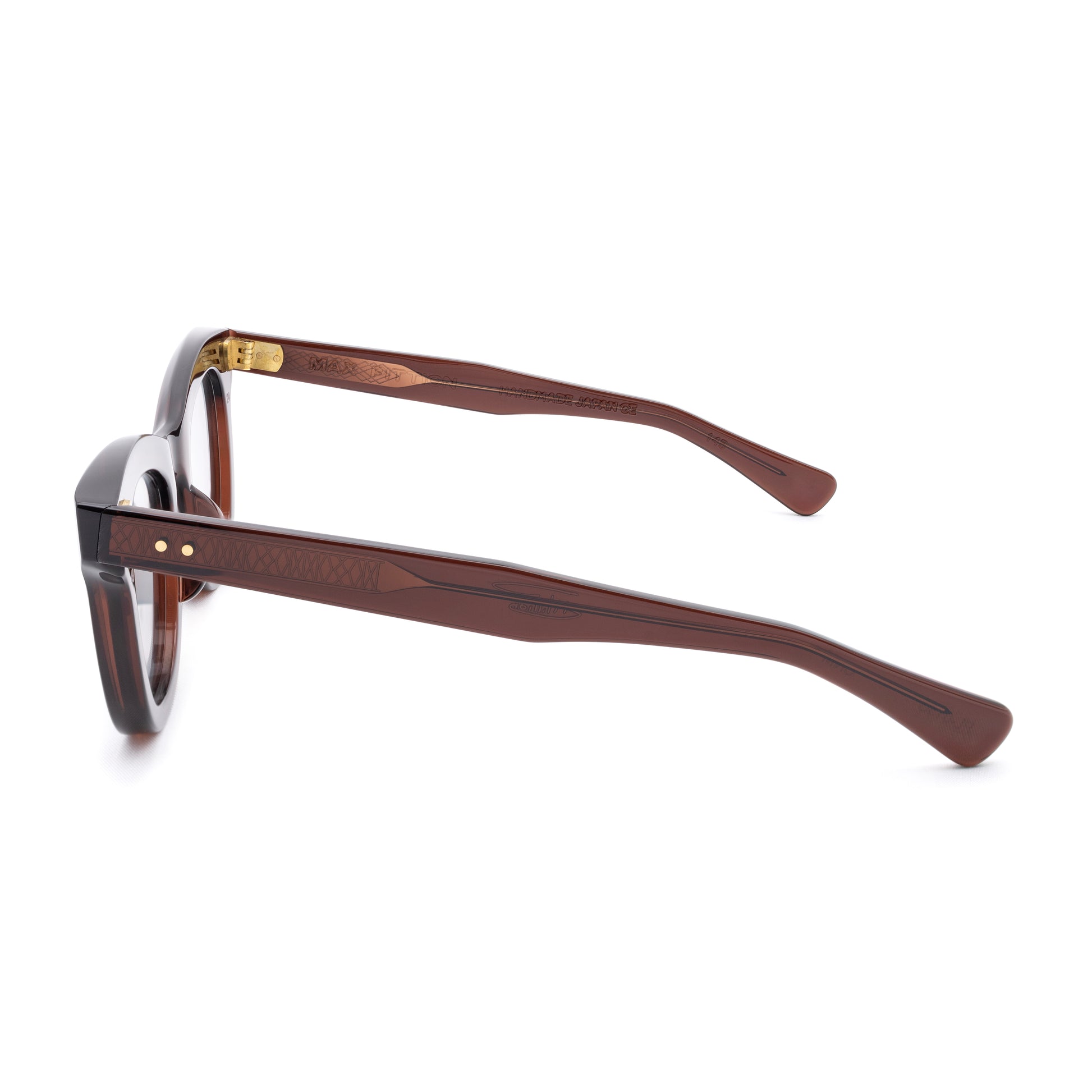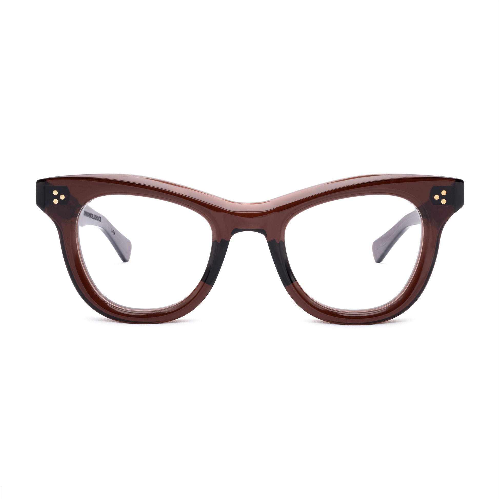 THE FRONT IS TRIPLE RIVETED WITH BRASS PINS, THE SIDE HORIZONTAL DOUBLE PINS. A HEAVY 5-BARREL BRASS HINGE IS THE CONNECTIVE ACTION OF THE FRAME. THE TEMPLE SHAPE MOVES BACK STRAIGHT AND ARTICULATES DOWN JUST BEFORE THE EAR AREA THEN ENDS IN A SQUARED ROUND TIP. SIZE 49□24-145