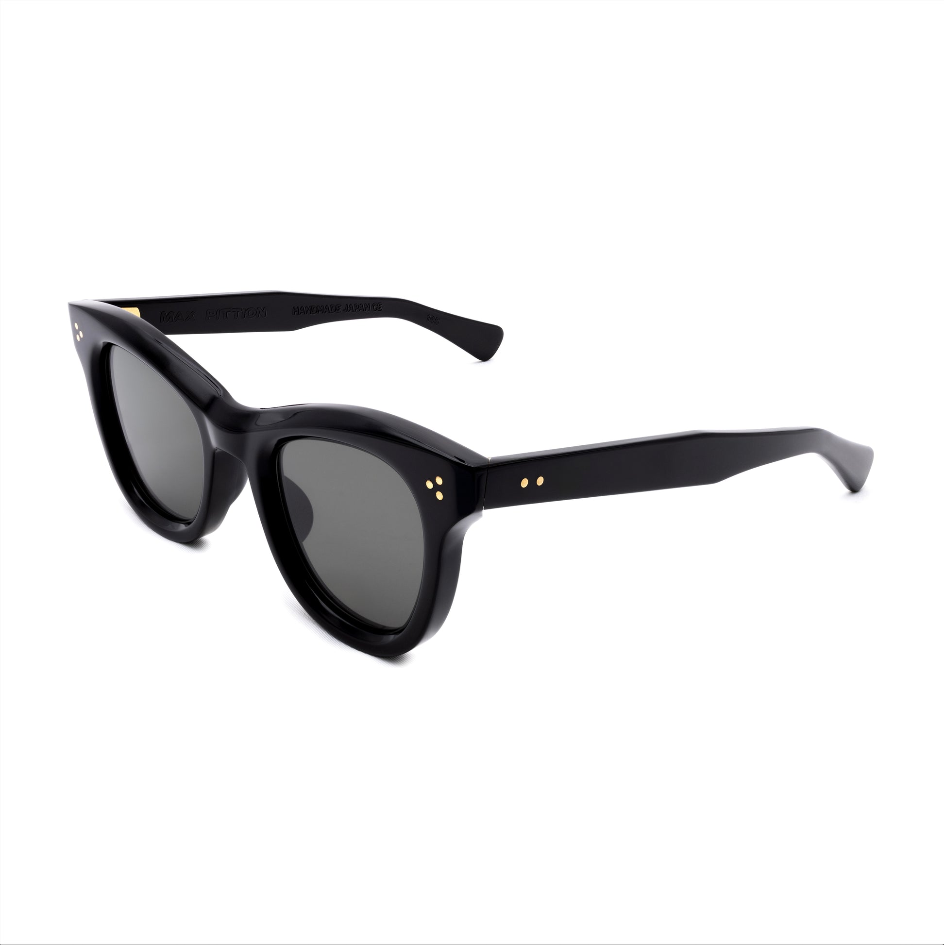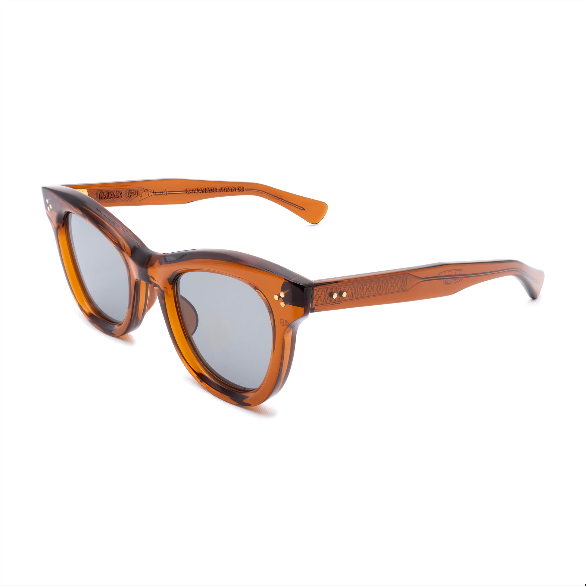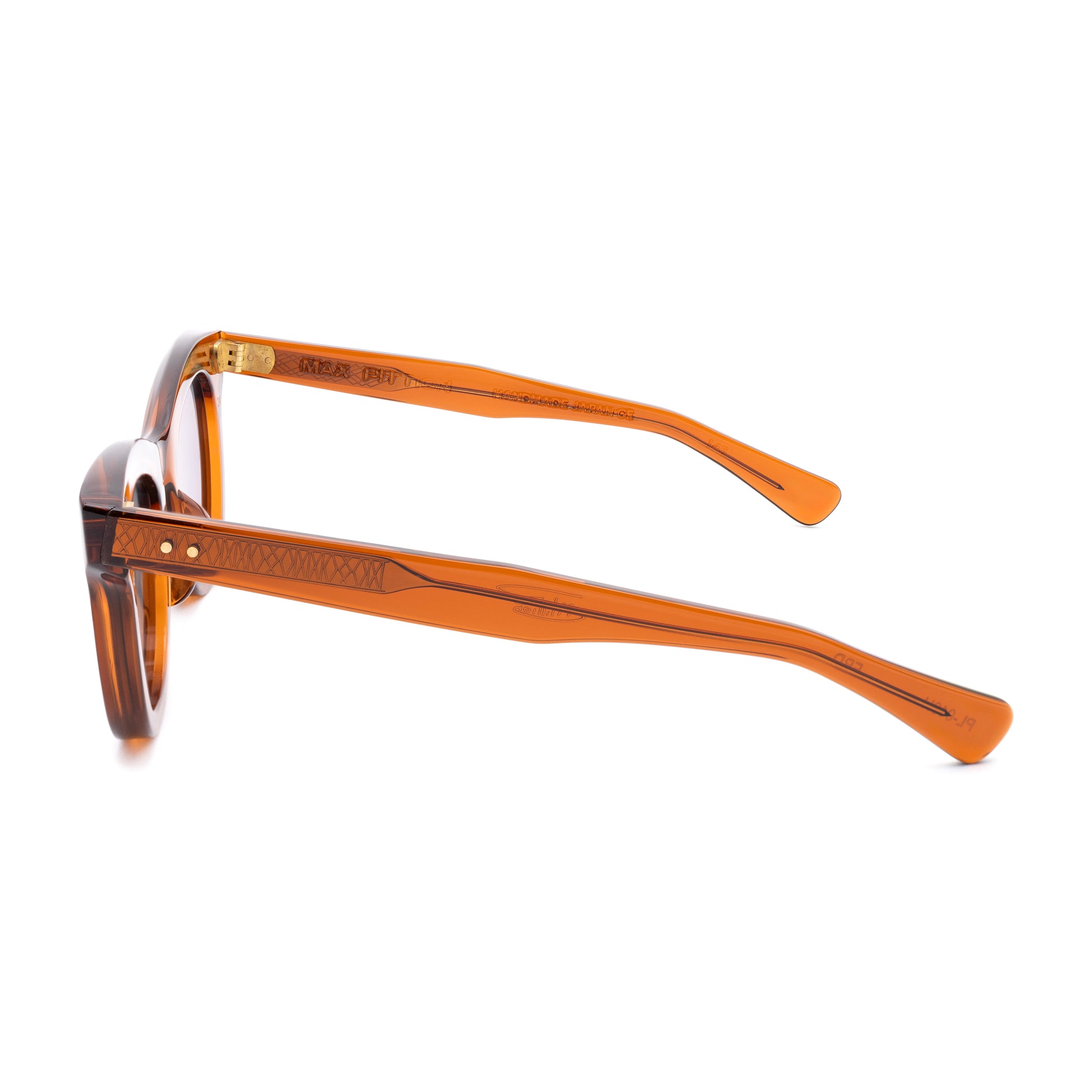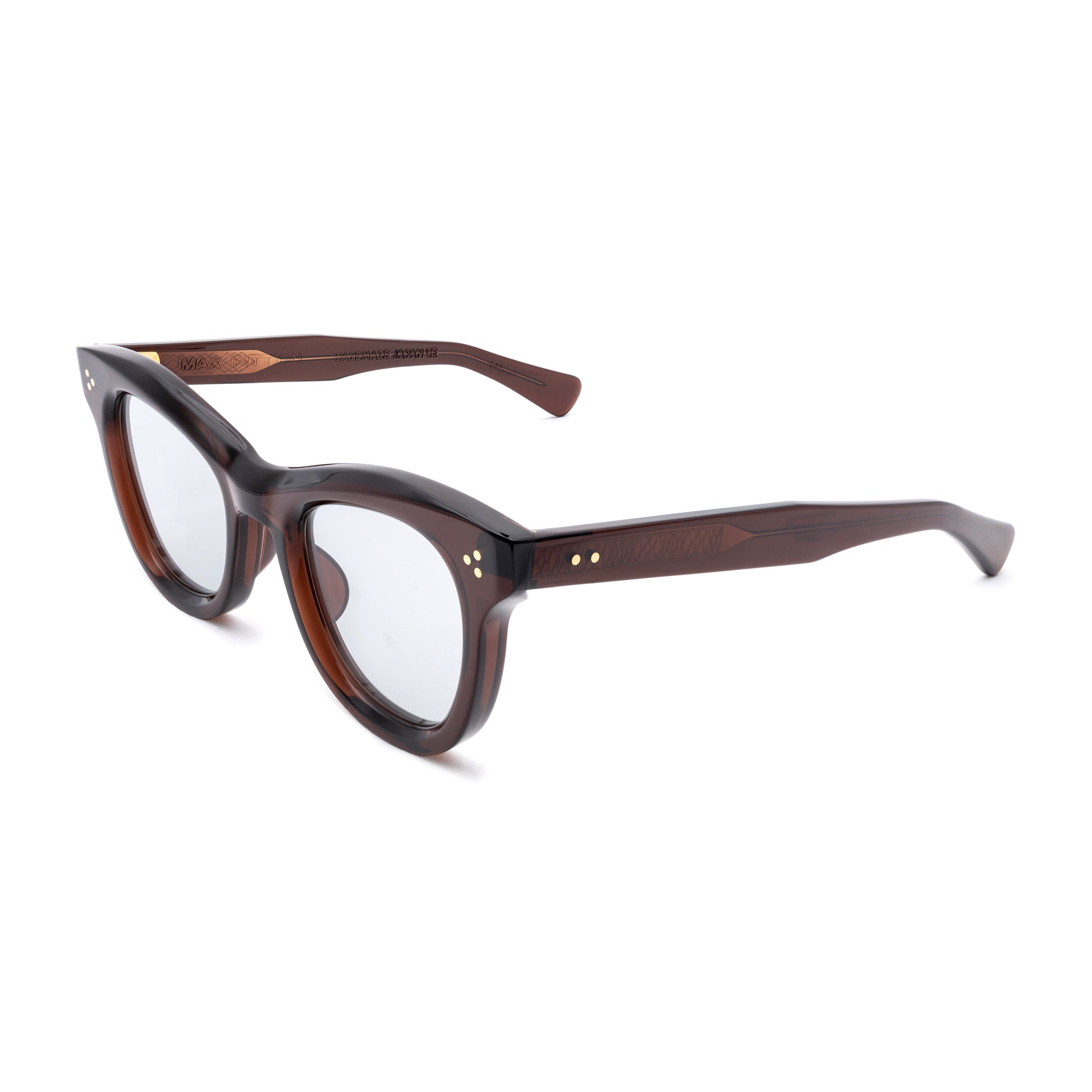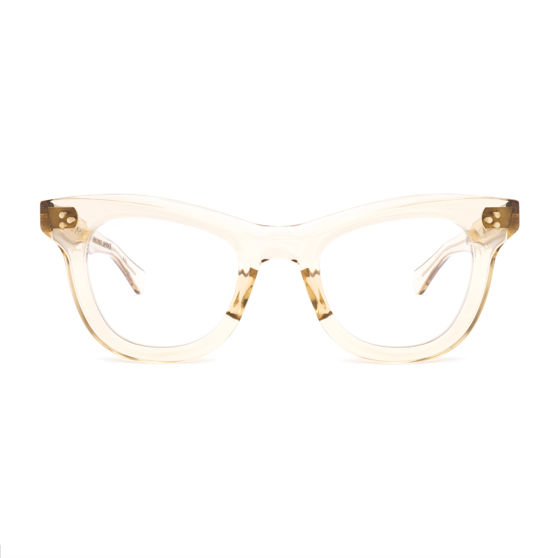 THE FRONT IS TRIPLE RIVETED WITH BRASS PINS, THE SIDE HORIZONTAL DOUBLE PINS. A HEAVY 5-BARREL BRASS HINGE IS THE CONNECTIVE ACTION OF THE FRAME. THE TEMPLE SHAPE MOVES BACK STRAIGHT AND ARTICULATES DOWN JUST BEFORE THE EAR AREA THEN ENDS IN A SQUARED ROUND TIP. SIZE 49□24-145