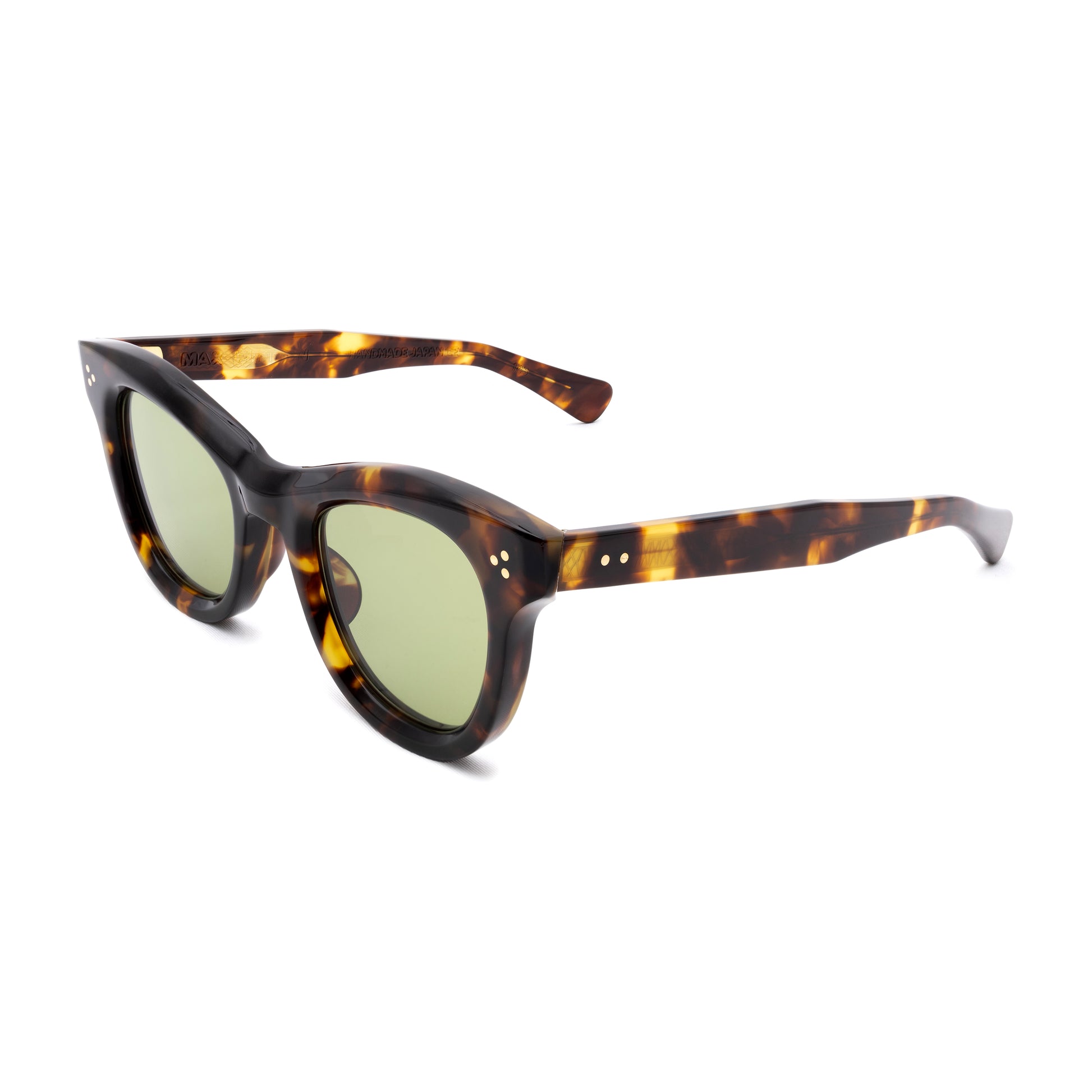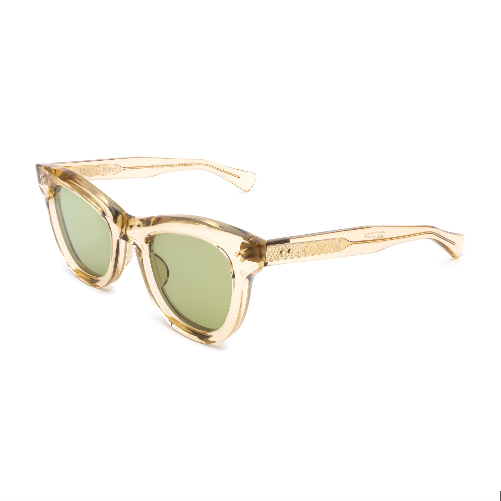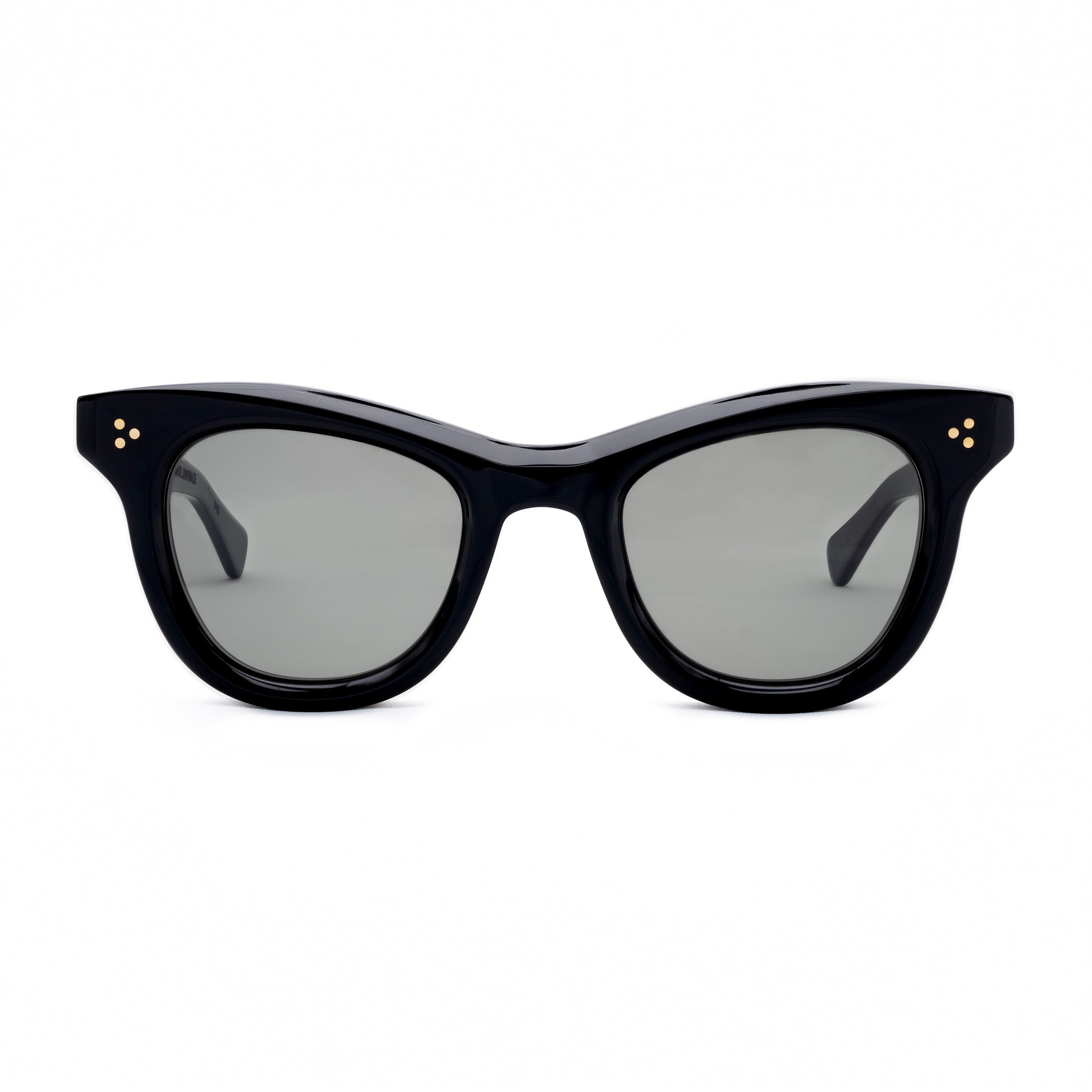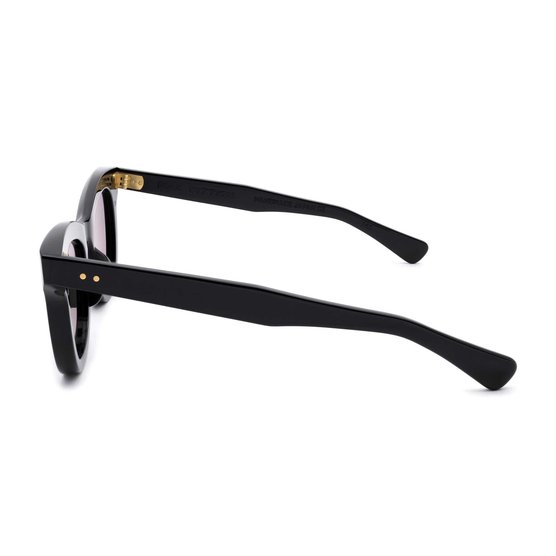 THE FRONT IS TRIPLE RIVETED WITH BRASS PINS, THE SIDE HORIZONTAL DOUBLE PINS. A HEAVY 5-BARREL BRASS HINGE IS THE CONNECTIVE ACTION OF THE FRAME. THE TEMPLE SHAPE MOVES BACK STRAIGHT AND ARTICULATES DOWN JUST BEFORE THE EAR AREA THEN ENDS IN A SQUARED ROUND TIP. SIZE 49□24-145