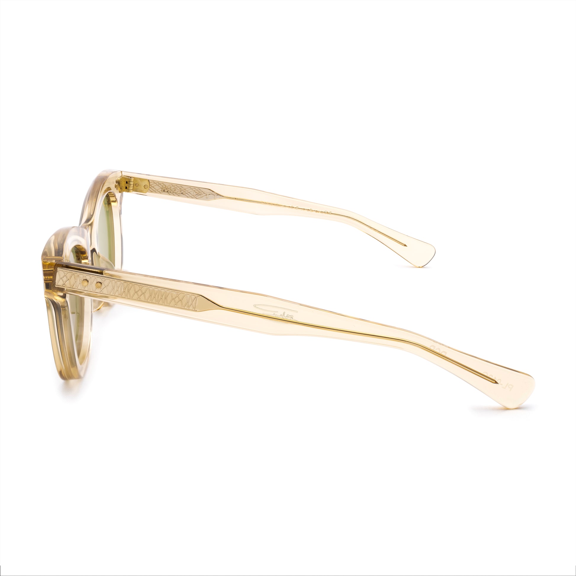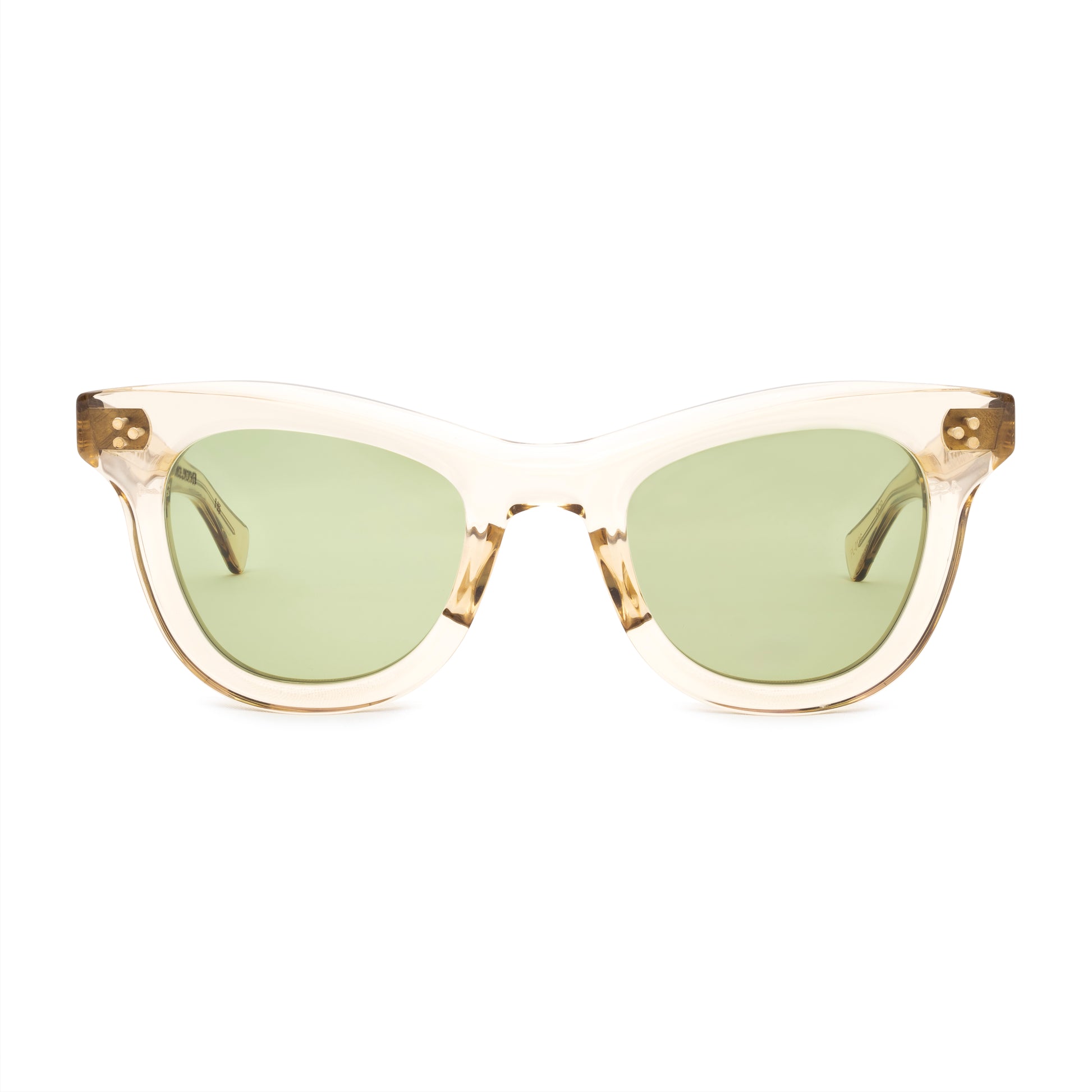 DEEP AND LOVELY. THE LENS SHAPE IS TWEAKED IN, AND THE BOTTOM IS ROUNDED WITH A DEEP TV CUT. THE CONNECTIONS ARE SQUARED OFF AND SIT HIGH ON THE FRONT.