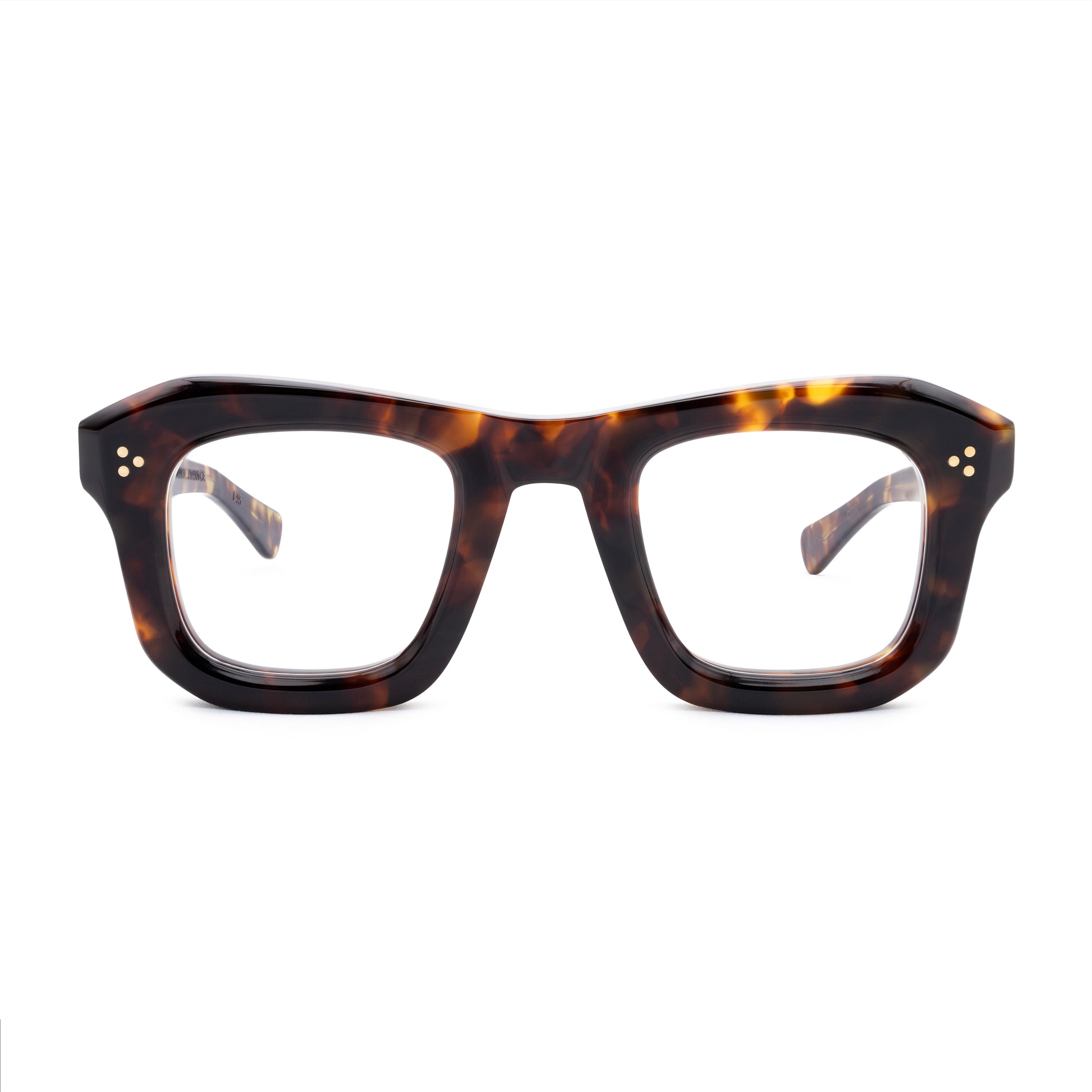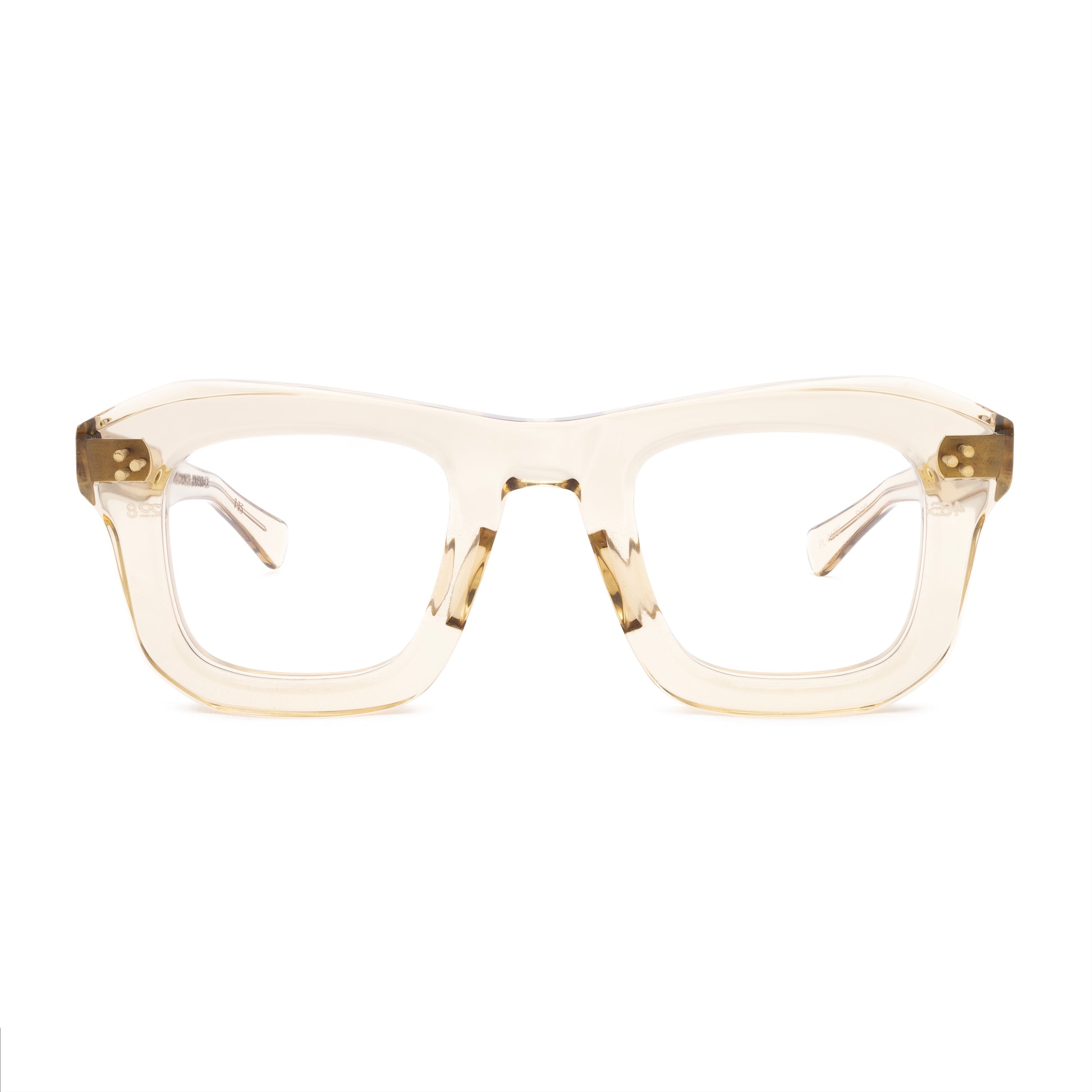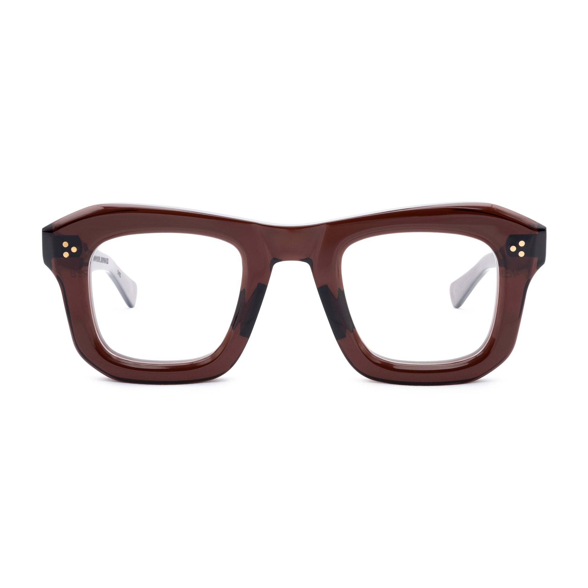 THE FRONT IS TRIPLE RIVETED WITH BRASS PINS, THE SIDE HORIZONTAL DOUBLE PINS. A HEAVY 5-BARREL BRASS HINGE IS THE CONNECTIVE ACTION OF THE FRAME. THE TEMPLE SHAPE MOVES BACK STRAIGHT AND ARTICULATES DOWN JUST BEFORE THE EAR AREA THEN ENDS IN A SQUARE ROUND TIP. SIZE 46□28-145