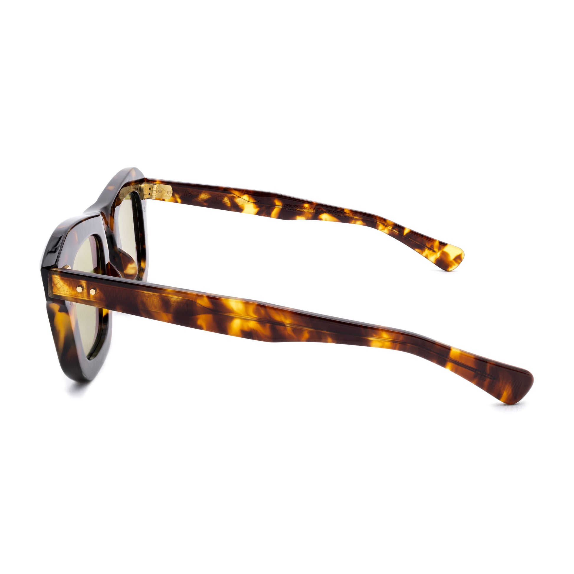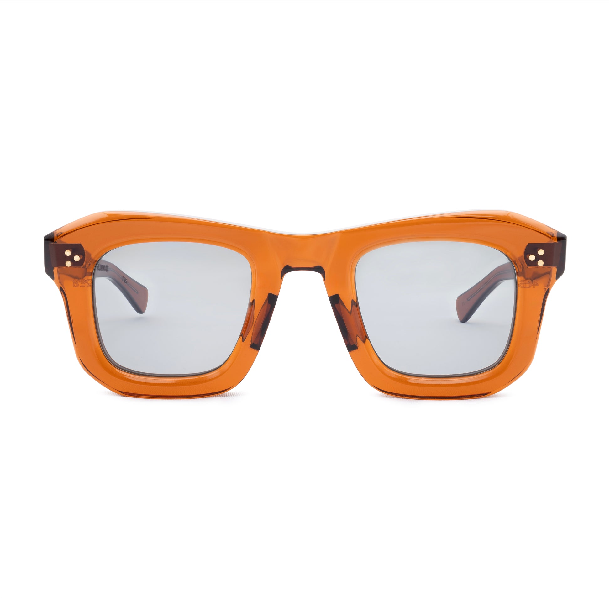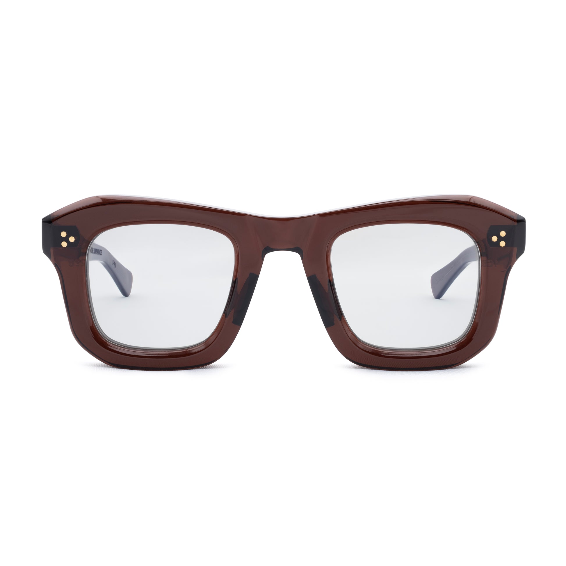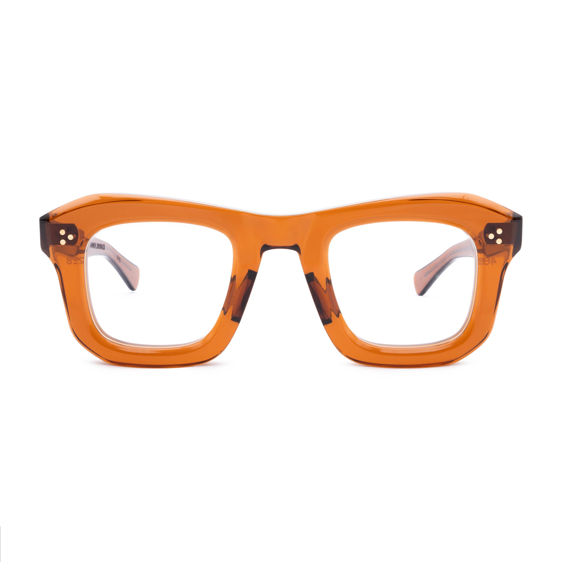 THE FRONT IS TRIPLE RIVETED WITH BRASS PINS, THE SIDE HORIZONTAL DOUBLE PINS. A HEAVY 5-BARREL BRASS HINGE IS THE CONNECTIVE ACTION OF THE FRAME. THE TEMPLE SHAPE MOVES BACK STRAIGHT AND ARTICULATES DOWN JUST BEFORE THE EAR AREA THEN ENDS IN A SQUARE ROUND TIP. SIZE 46□28-145